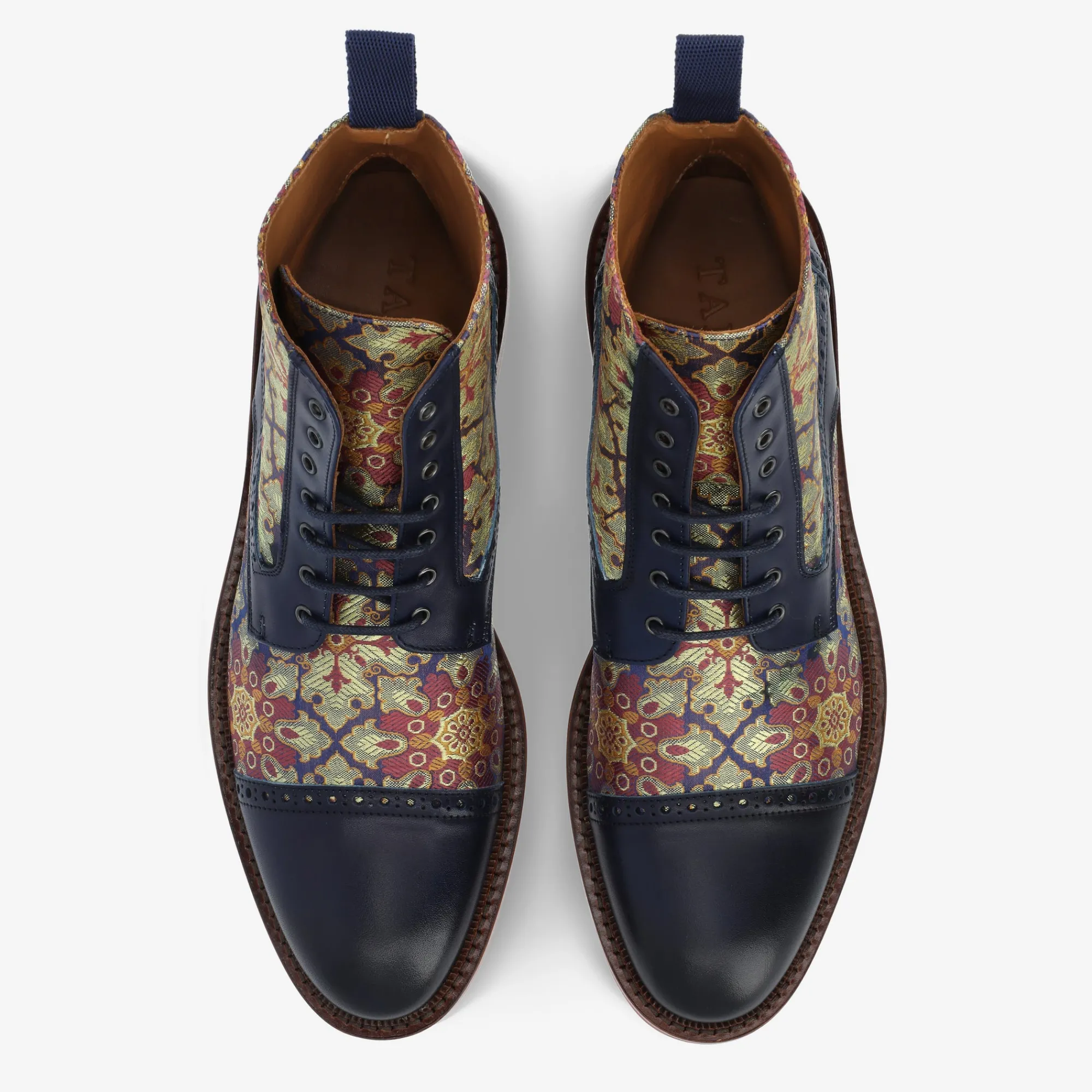 Go Bold With Our Milano Boot In Atlas, Featuring A Supportive Cushioned Insole, A Classic Lace-Up Closure, And Premium Genuine Leather In Navy And Jacquard Uppers That Offer Timeless Style And Quality You Can Lean On All Season Long, Year After Year. With A Pair Of Boots Like These In Your Rotation, You’Ll Always Look And Feel Your Best. An Almond Toe And New Shoe Dog Sole In Red Rubber Finishes This Classic Look For A Fresh Spin.