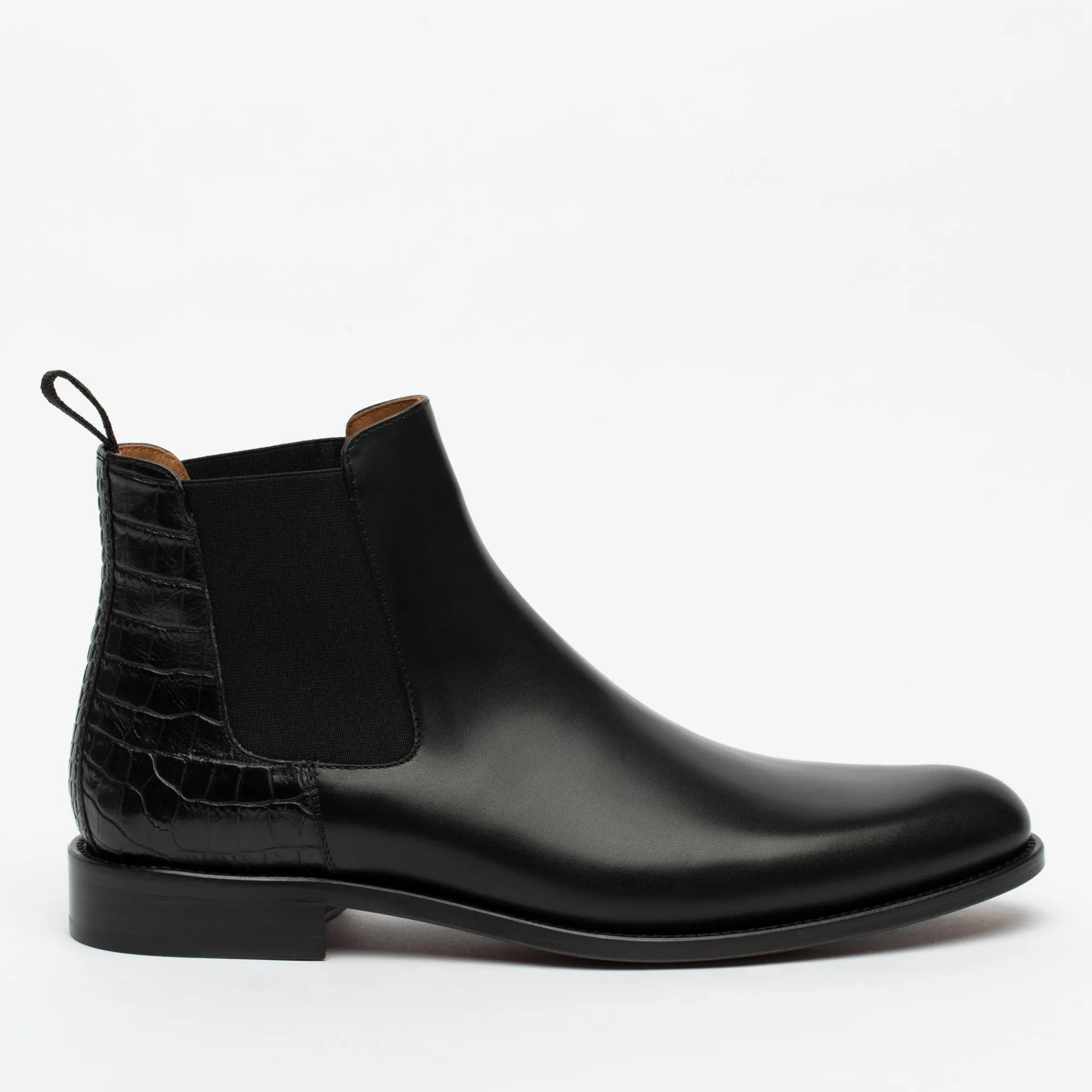 Our Hiro Boot In Midnight Features A Bold Update From The Classic Chelsea Style Giving You That Perfect New Jump Into Our Boot Collection. With Their Easy Pull-On And Pull-Off Feature, They Are Going To Be A Nice Fit For All Those Special Occasions. The Upper Material Has Been Constructed From A Boxcalf Leather From Italy, And The Cuff Is Constructed From A Full Grain Leather With An Embossed Croc Detailing. The Interior Is Fully-Lined With Natural Calfskin, And The Sole Unit Is Stacked Leather With A Rubber Insert. They Easily Become An Instant Favorite Having Them Made With Blake Construction.
