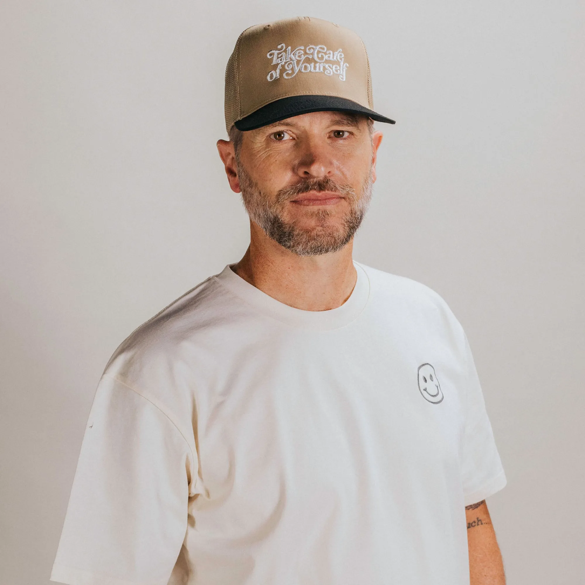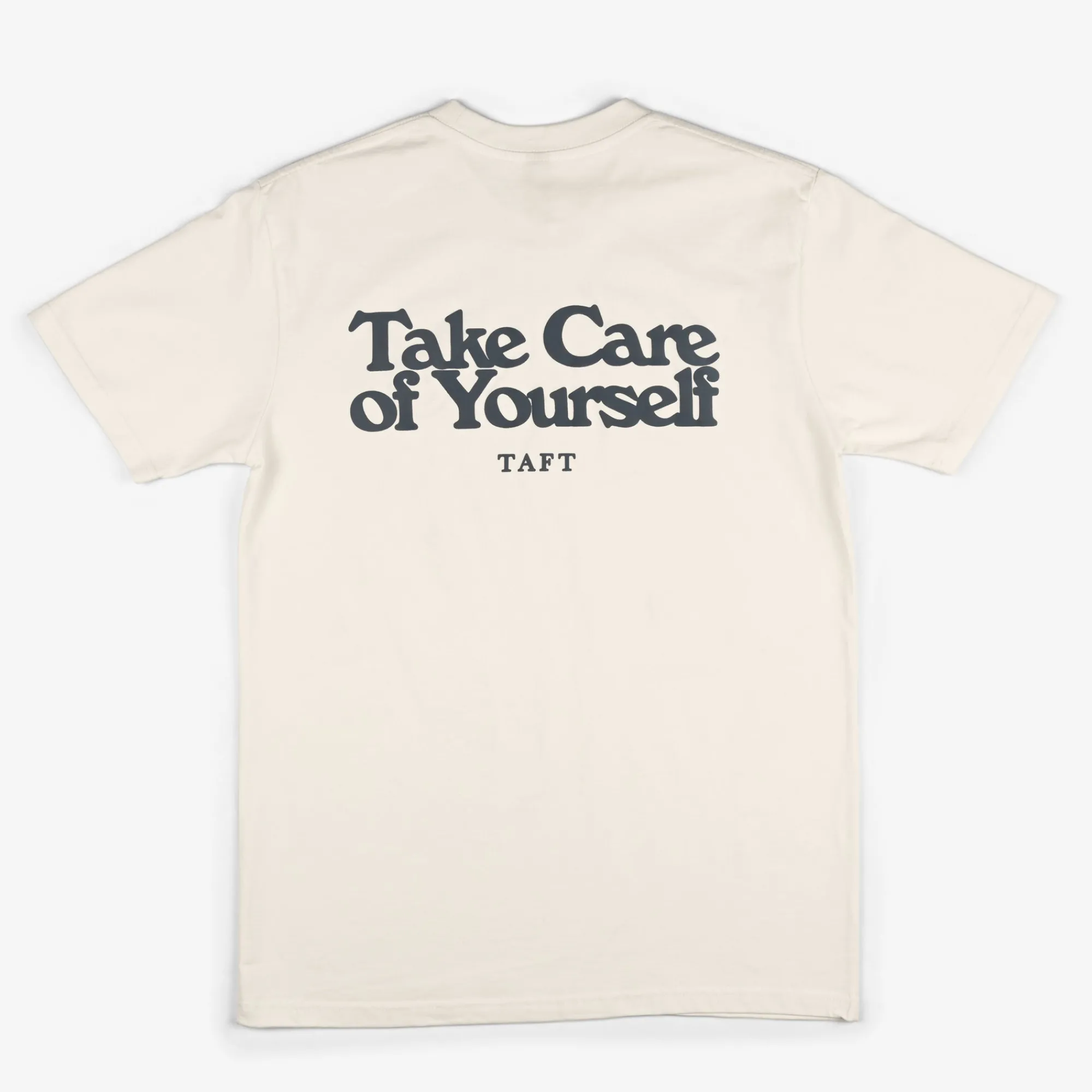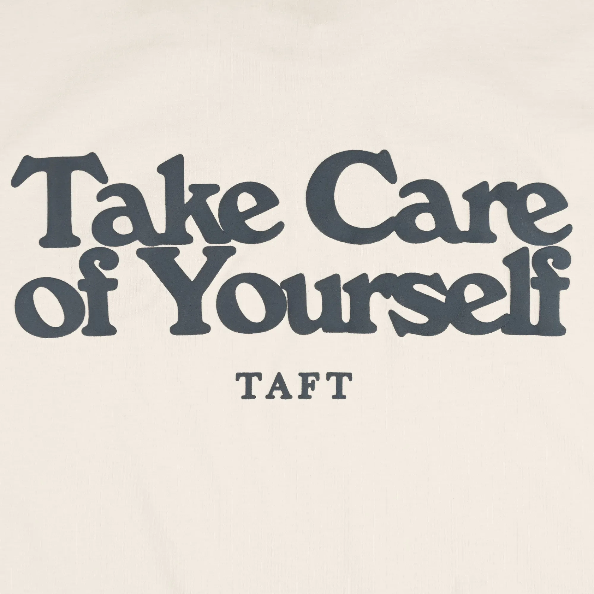 Mental Health Has Always Been At The Heart Of Taft. Our Take Care Short Sleeve T-Shirt In Ecru Serves As A Kind Reminder To Take Care Of Yourself—Compassion, Grace And Hope Will Get You Through The Tough Times. You Are Enough And Worthy Of Care. Features A “Take Care Of Yourself” Message In Puff Print On The Back And Embroidered Charcoal Smiley Face On The Chest.