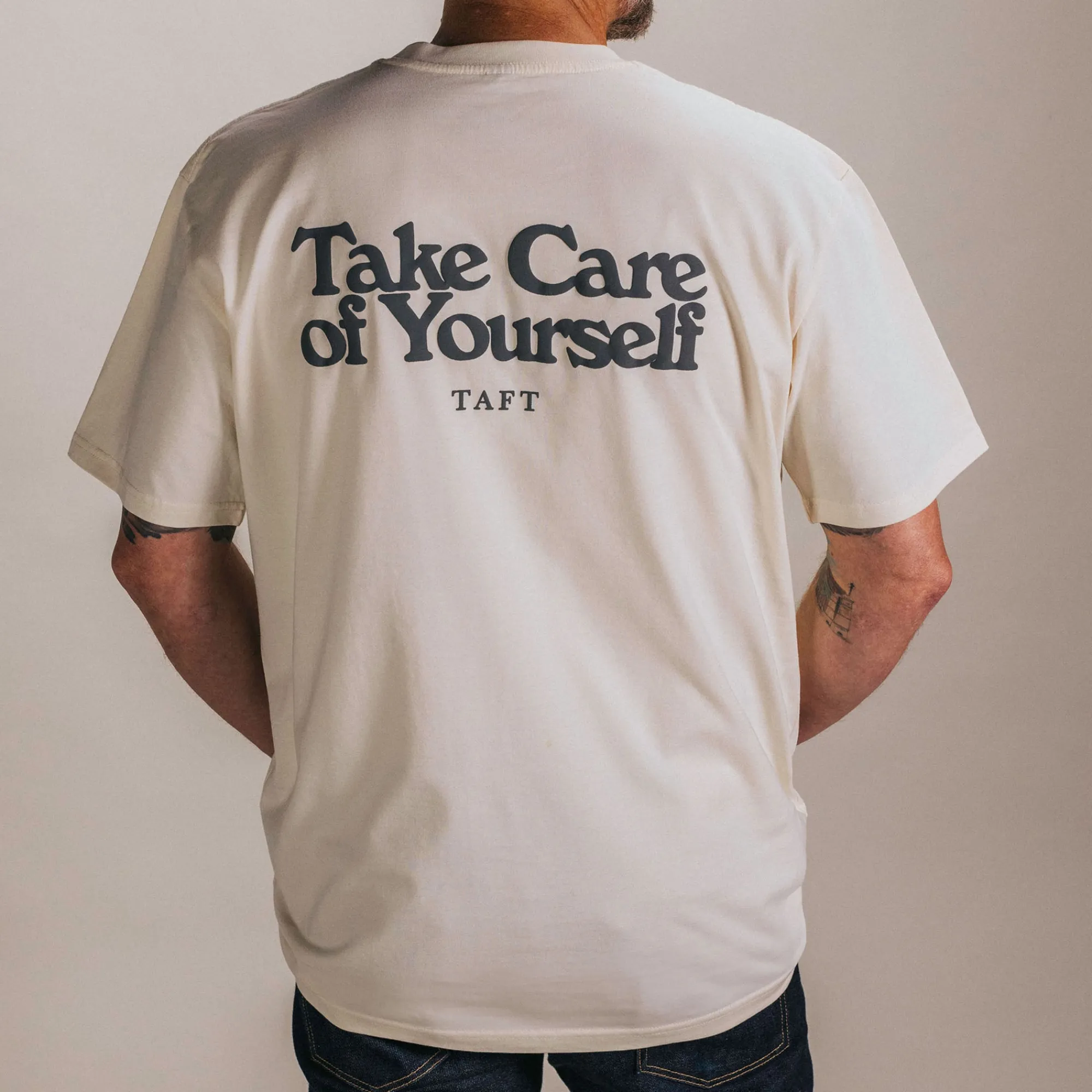 Mental Health Has Always Been At The Heart Of Taft. Our Take Care Short Sleeve T-Shirt In Ecru Serves As A Kind Reminder To Take Care Of Yourself—Compassion, Grace And Hope Will Get You Through The Tough Times. You Are Enough And Worthy Of Care. Features A “Take Care Of Yourself” Message In Puff Print On The Back And Embroidered Charcoal Smiley Face On The Chest.